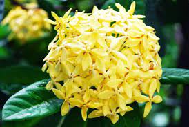 Lá bông trang vàng mọc đối xứng, bìa liền dài từ 5-10 cm, rộng từ 3-5 cm, phiến lá có hình bầu dục, hơi nhọn ở đầu. Lá có màu xanh nhạt, mặt dưới lá màu nhạt hơn. Hoa trang nhỏ, ống tràng hẹp, 4 đài và 4 tràng. Hoa mọc thành chùm lớn khoảng vài chục hoa cùng 1 lúc ở đầu cành, thường có màu đỏ.