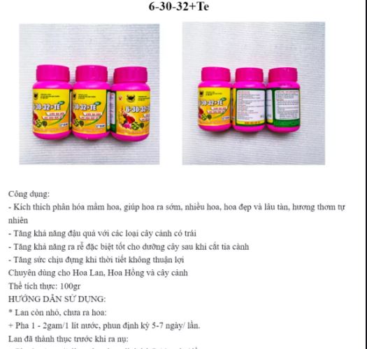 Thể tích thực: 100gr. Thành phần: -NPK: 6-30-32 -TE : các chất trung vi lượng cần thiết trong quá trình ra hoa, đậu trái và nuôi trái lớn.