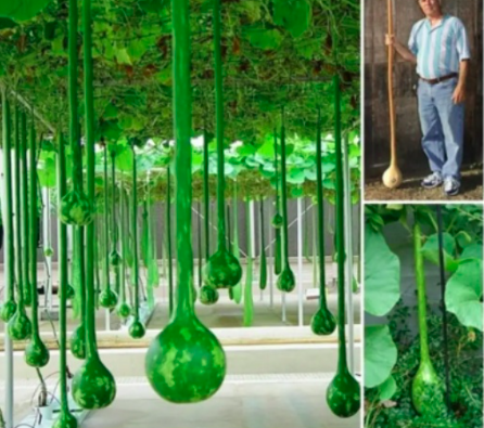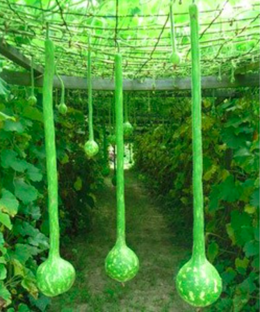 Bầu Gáo Dừa (Lagenaria siceraria) 90 – 120 ngày, trái tròn đường kính 25cm ở cuối và có cán dài tối đa 50cm.