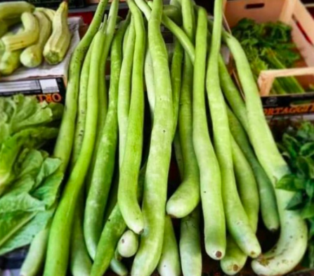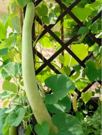 Trái dài 0.5 – 1.3m, ăn được, có thể trẳng hoặc cong, tùy bề mặt tiếp xúc với trái và phương pháp uốn, da xanh trắng và thịt trắng nhạt. Trái già có thể dùng để vẽ, sơn để ra hình con trăn sống động. Thu trái trong 100 ngày.