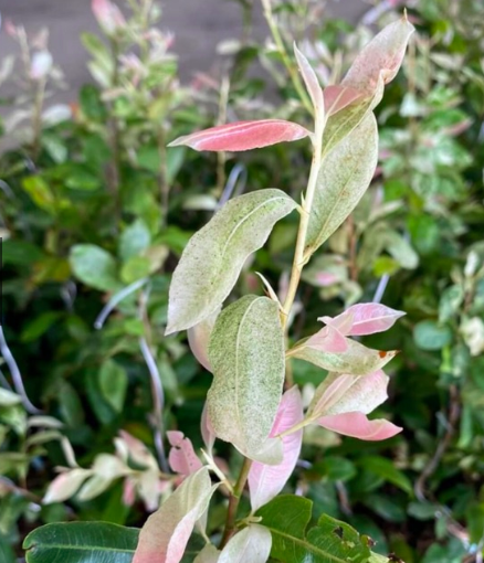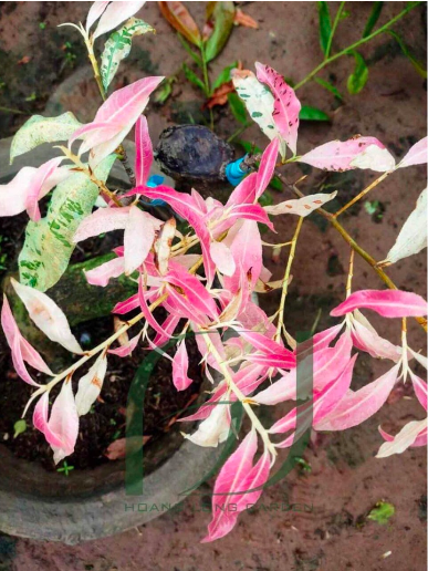 Đọt lá non có màu hồng đỏ, dần dần chuyển xanh màu xanh nhạt xen lẫn màu trắng những đặc điểm rất dễ nhận biết của giống mai này.