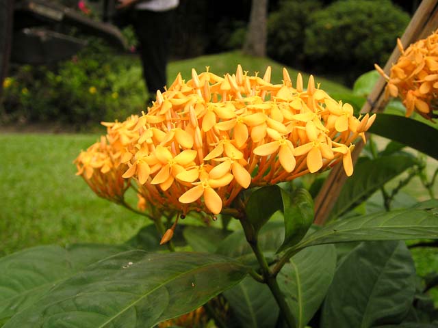Lá bông trang vàng mọc đối xứng, bìa liền dài từ 5-10 cm, rộng từ 3-5 cm, phiến lá có hình bầu dục, hơi nhọn ở đầu. Lá có màu xanh nhạt, mặt dưới lá màu nhạt hơn. Hoa trang nhỏ, ống tràng hẹp, 4 đài và 4 tràng. Hoa mọc thành chùm lớn khoảng vài chục hoa cùng 1 lúc ở đầu cành, thường có màu đỏ.