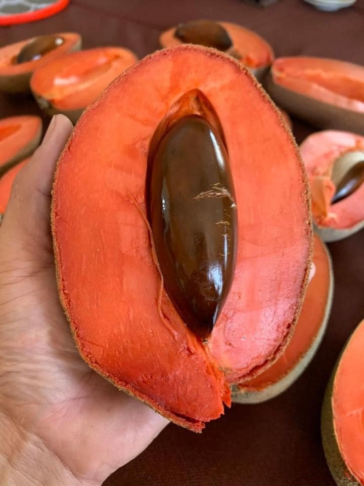 - Vỏ quả có nhiều gai sần nhỏ mầu nâu nhạt đặc biệt thịt quả màu đỏ khá lạ mắt.