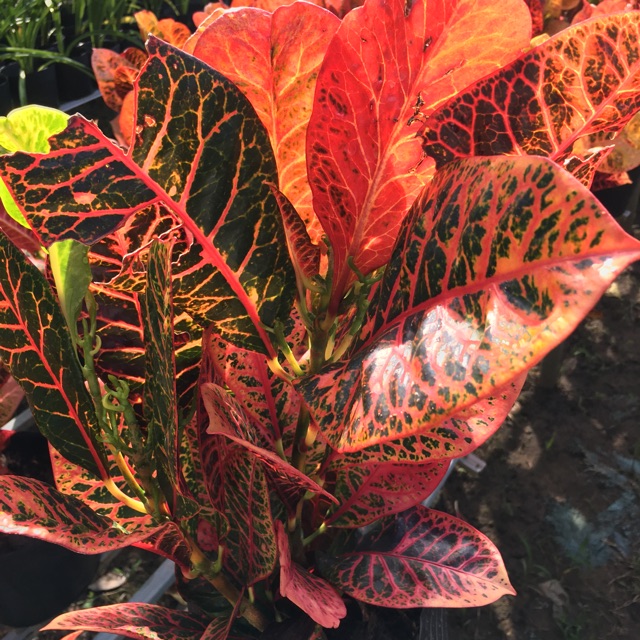 Lá của cây có hình trứng ngược, bề mặt lá thô ráp, mép lá có hình răng cưa sâu. Lá màu ngũ sắc rất đa dạng về màu sắc trên cùng một thân cây.