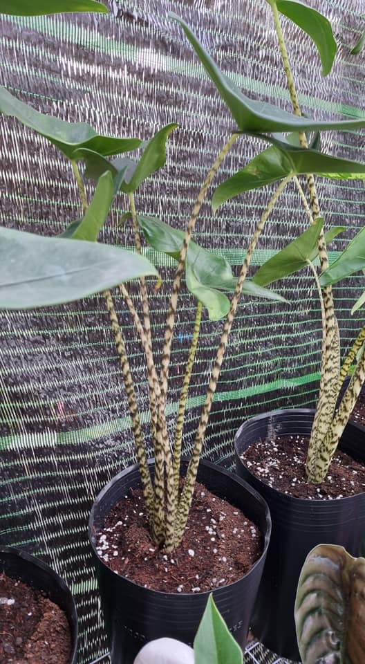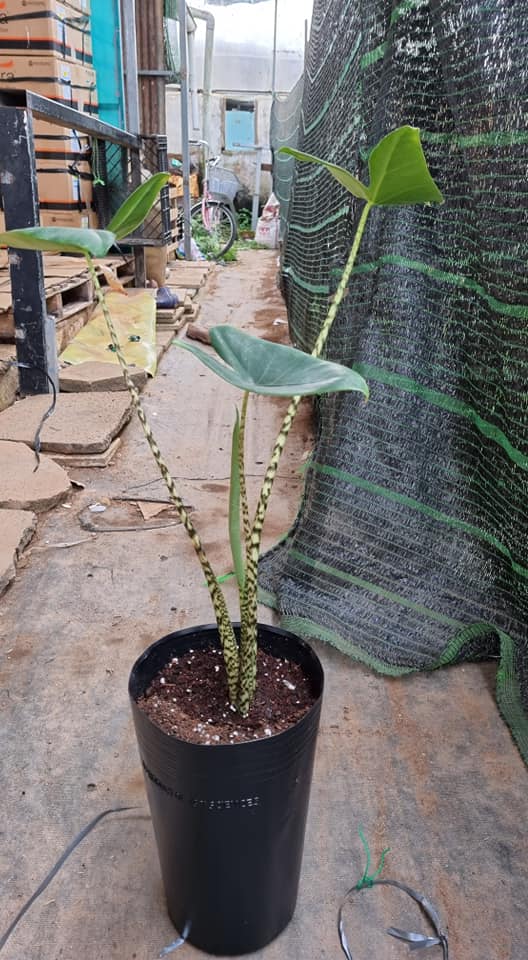 - Cây sở hữu lá kích thước khá lớn tương tự như tai voi. Thân cây thẳng đứng, có đặc điểm nổi bật là có sọc hình ngựa vằn dọc theo thân cây mảnh.