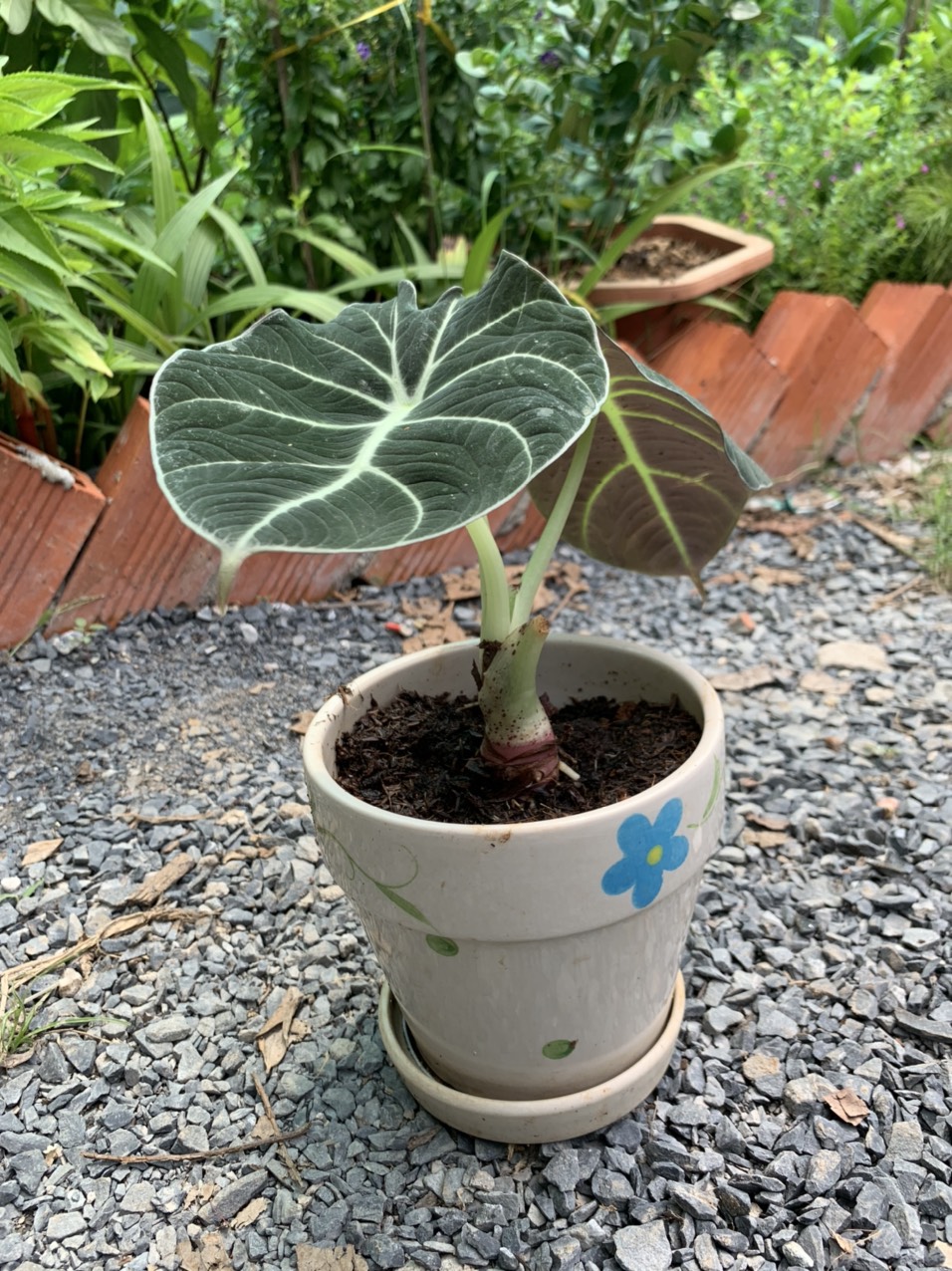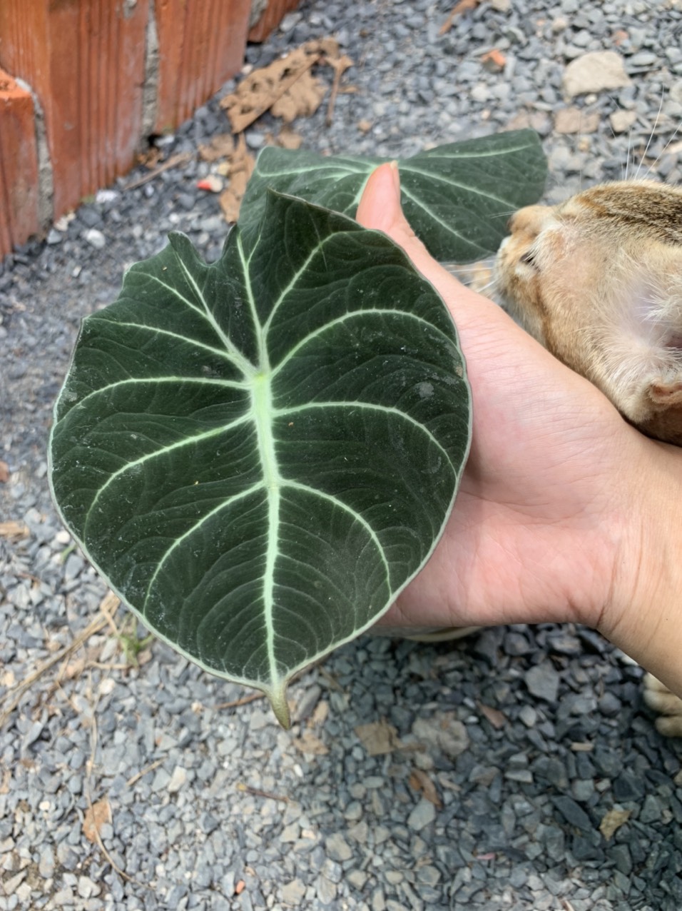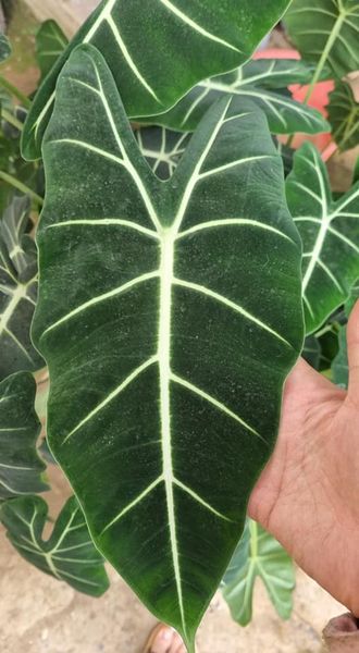 Lá môn nhung có nhiều gân nổi màu trắng nổi bật, hình tam giác ngược, hoặc hình tim màu xanh đậm như nhung, kích thước mỗi lá có chiều dài từ 20-30cm và rộng từ 10-20cm.