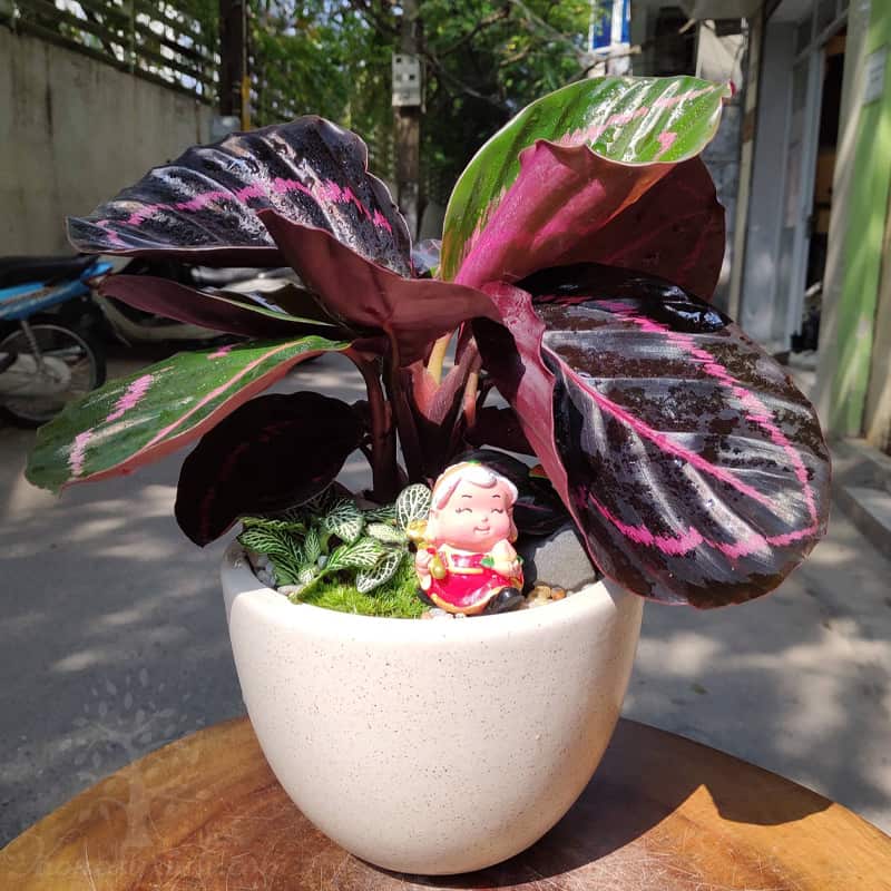 Đuôi Công Tím (tên khoa học: Calathea Medallion), được tìm thấy tại vùng nhiệt đới Nam Mỹ. Đây là loài cây thân thảo, toàn thân có màu tím đỏ nổi bật và ấn tượng thuộc họ củ dong, sống thành từng bụi. Đặc biệt cả thân và rễ cây đều nằm dưới mặt đất, chỉ có phần lá là mọc bên trên.