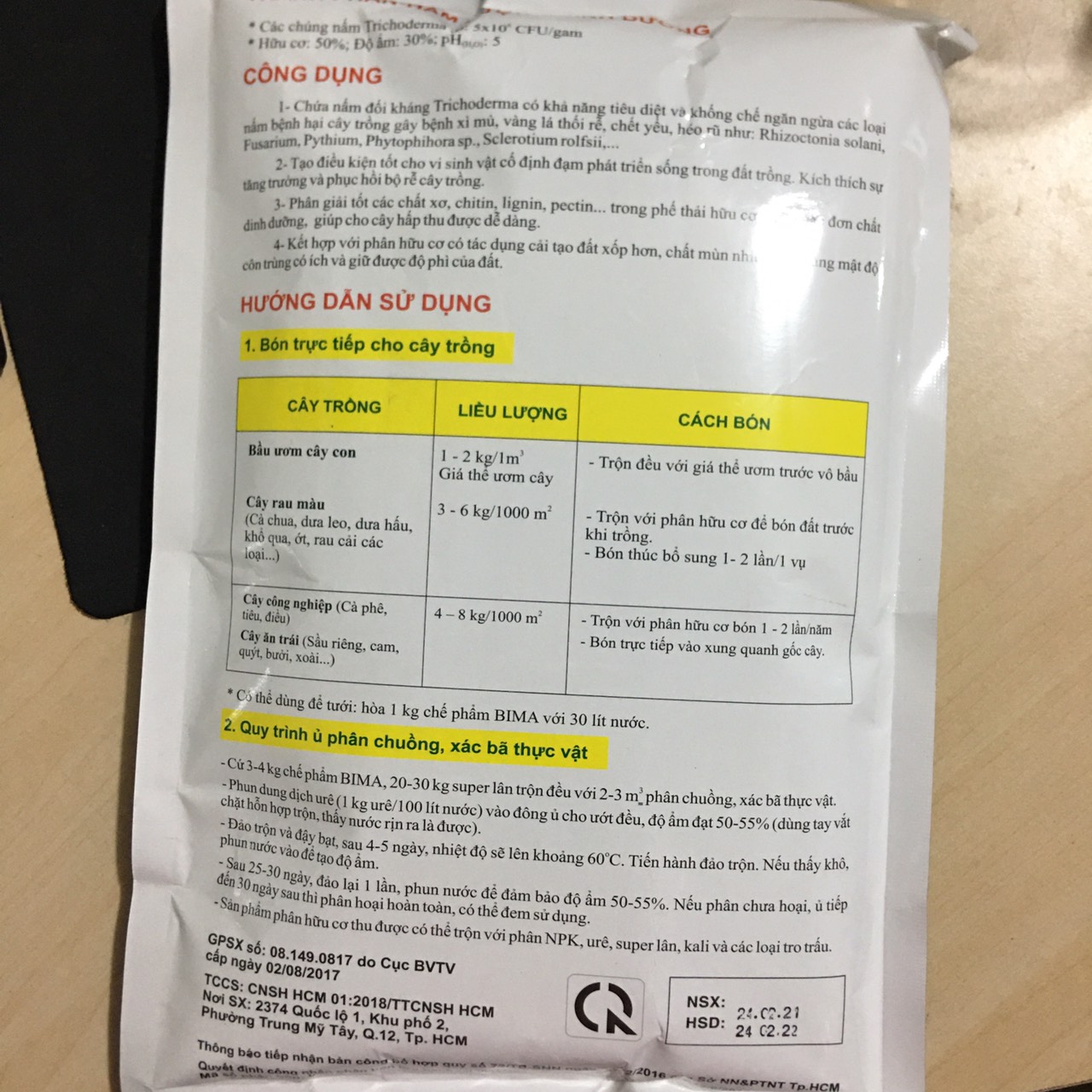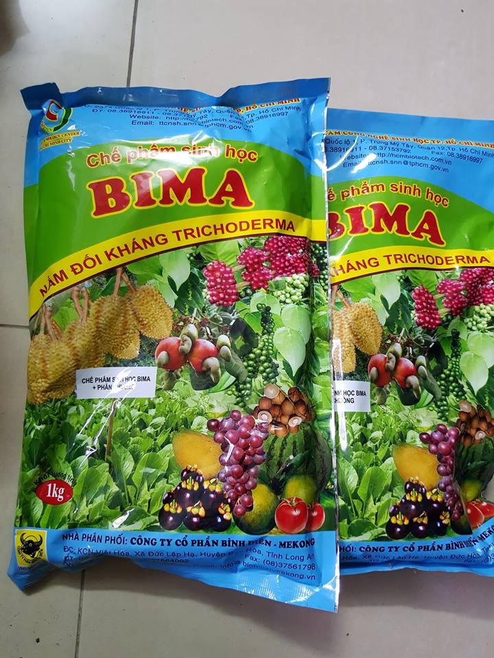 Chế phẩm sinh học Trichoderma BIMA là sản phẩm được Trung tâm Công nghệ sinh học TP. HCM nghiên cứu và sản xuất, có chứa vi nấm Trichoderma là loại nấm đối kháng có tác dụng cao trong việc tấn công, ký sinh và ức chế nhiều loại nấm bệnh cây trồng. Bên cạnh đó, Trichoderma BIMA còn có khả năng thúc đẩy quá trình phân huỷ chất hữu cơ, giúp đất tơi xốp và giữ được độ phì của đất.