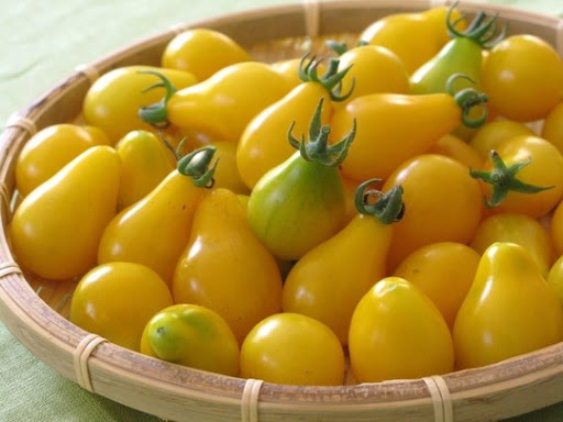 Cà chua hình quả lê, màu vàng tươi sáng, bề mặt vỏ căng bóng mịn màng trông rất hấp dẫn, không những thế còn cung cấp nhiều chất dinh dưỡng tốt cho sức khỏe. Mỗi quả khi thu hoạch có khối lượng khoảng 50 – 80g, trông be bé xinh xinh và chế biến món ăn hay trang trí thì cực kỳ đẹp mắt.
