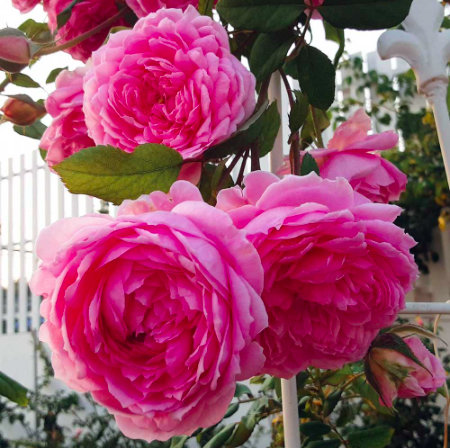 Những chồi non của hồng ngoại Huntington gần như màu tím biếc, trông có vẻ quyến rũ khi kết hợp cùng với màu sắc tươi sáng của hoa hồng Huntington rose.
