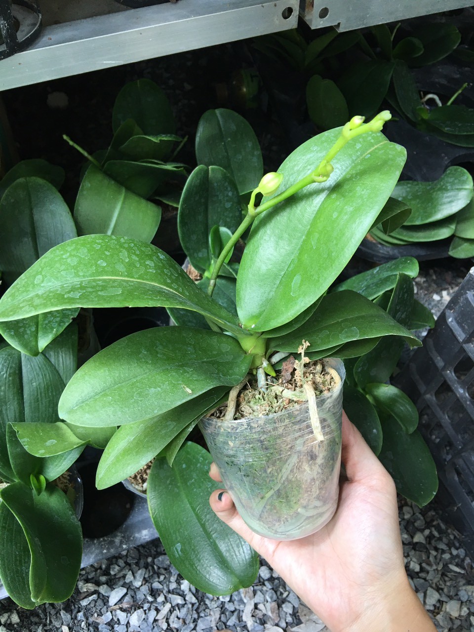 - Cây con trong chai được lấy ra nhẹ nhàng, rửa sạch môi trường còn dính trên rễ cây đến khi thấy không còn nhớt, cắt bỏ những rễ, lá bị hư, thối. Sau đó xếp cây lên khay hoặc rổ nhựa cho ráo nước, nhưng không để quá khô làm mất sức của cây.