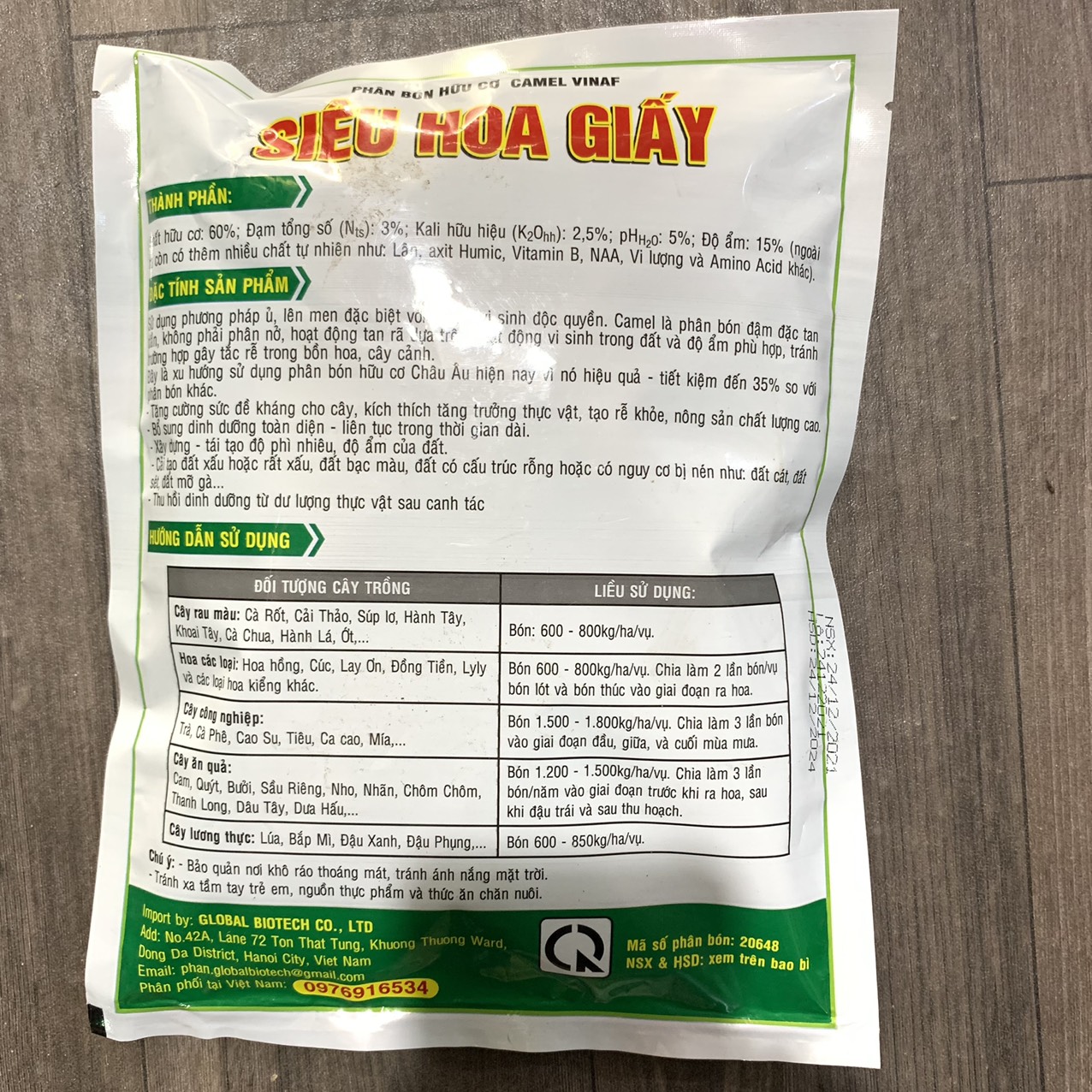 Chất hữu cơ: 60%; Đạm tổng số: 3%; Kali hữu hiệu: 2,5%; pH: 5%; Độ ẩm: 15% (ngoài ra còn có thêm nhiều chất tự nhiên như: Lân; axit Humic, Vitamin B, NAA, Vi lượng và Amino Acid khác).