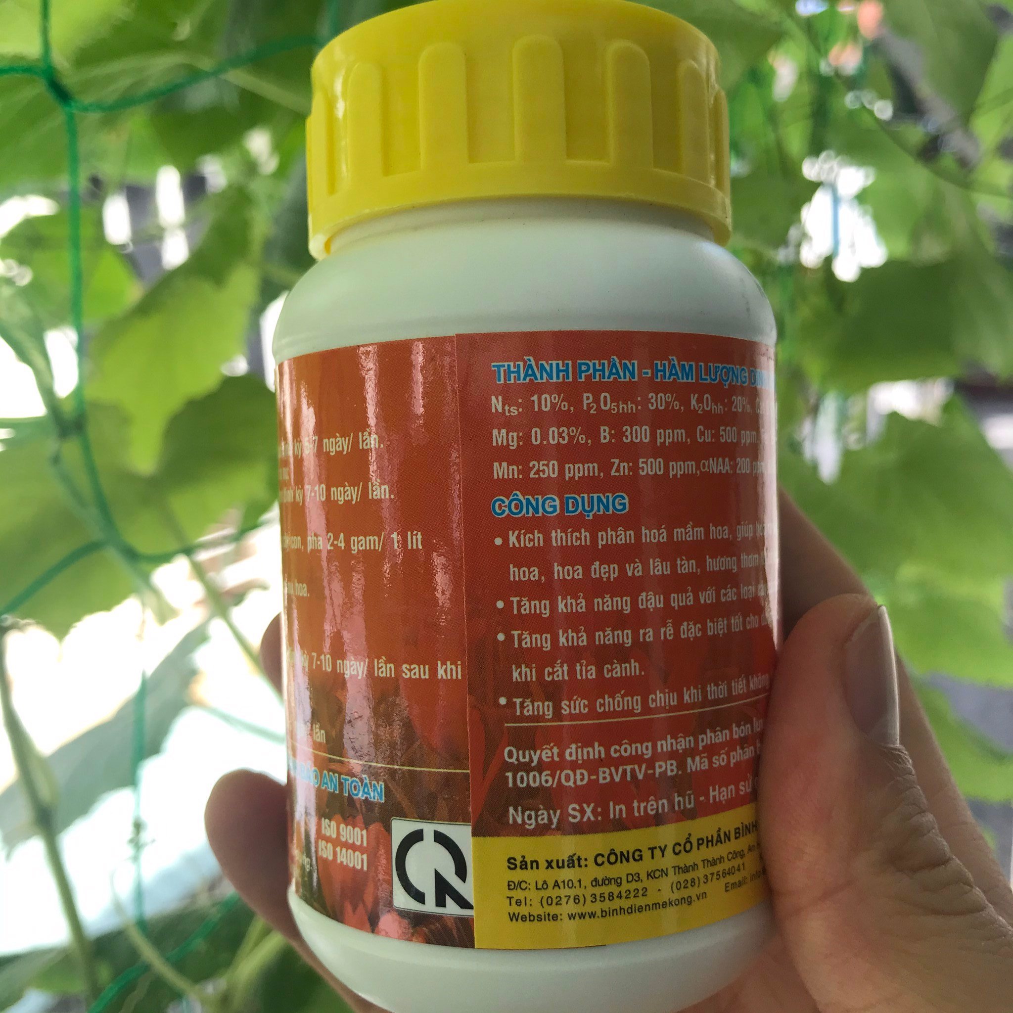 N tổng số: 10%; P2O5 hữu hiệu: 30%; K2O hữu hiệu: 20%; Ca: 0.035%; Mg: 0.03%; B: 300ppm; Cu: 500ppm; Fe: 500ppm; Mn: 250ppm; Zn: 500ppm; NAA: 200ppm.