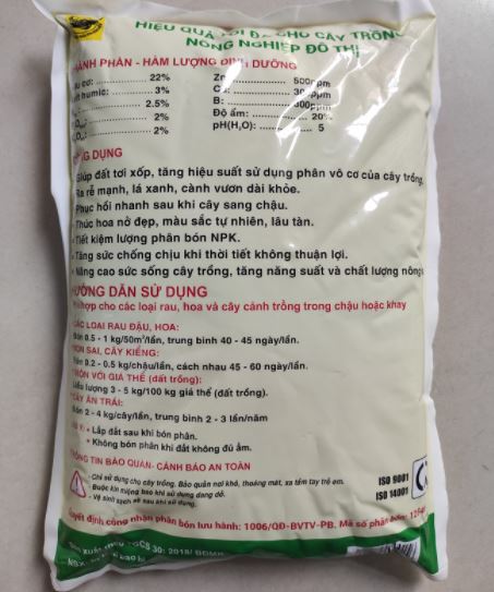 | Hữu cơ 22 %; Axit humic 3 %; Nts 2,5 %; P2O5hh 2 %; K2Ohh 2 %; Zn 500 ppm; Cu 300 ppm; B 300 ppm | |