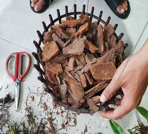 - Cách xử lý vỏ thông trước khi trồng lan: Ngâm nước 3 – 10 ngày cho no nước, sau đó ngâm nước vôi trong hoặc Physan 20 hoặc Benkona trong thời gian 30 phút, rửa lại bằng nước trong và sử dụng. Lan càng nhỏ thì nên chọn hoặc băm vỏ thông càng phải nhỏ.